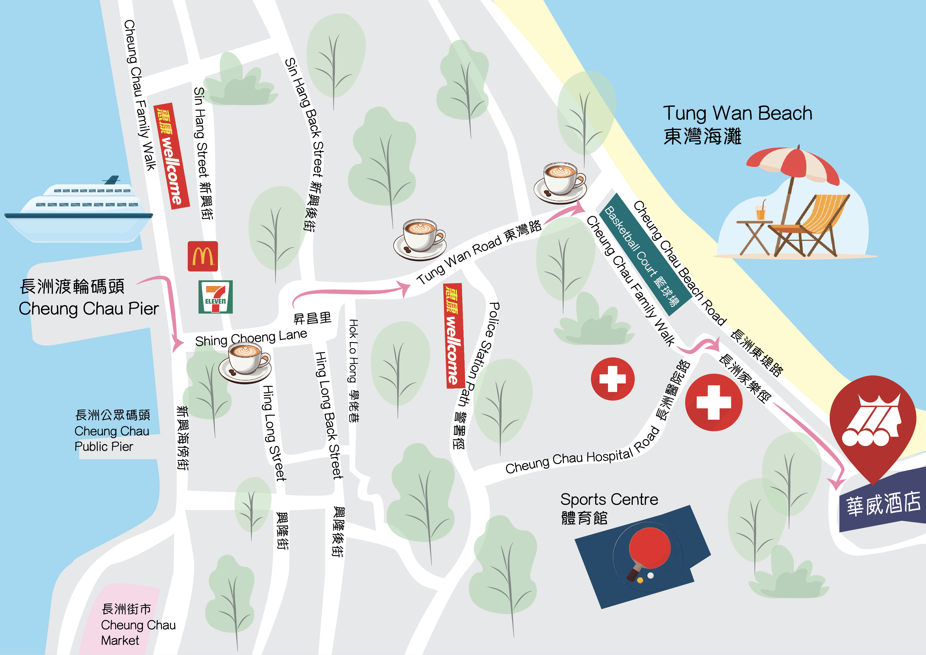 Upon arrival at Cheung Chau, head towards the direction of the Tung Wan Beach and walk on Tung Wan Road for 10 minutes to arrive at The Warwick Hotel.